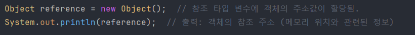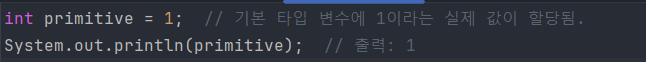 int primitive = 1;에서는 primitive 변수가 기본 타입이며, 1이라는 실제 값이 변수에 직접 저장된다.Object reference = new Object();에서는 reference 변수가 참조 타입이며, new Object()로 생성된 객체의 주소값이 저장된다.