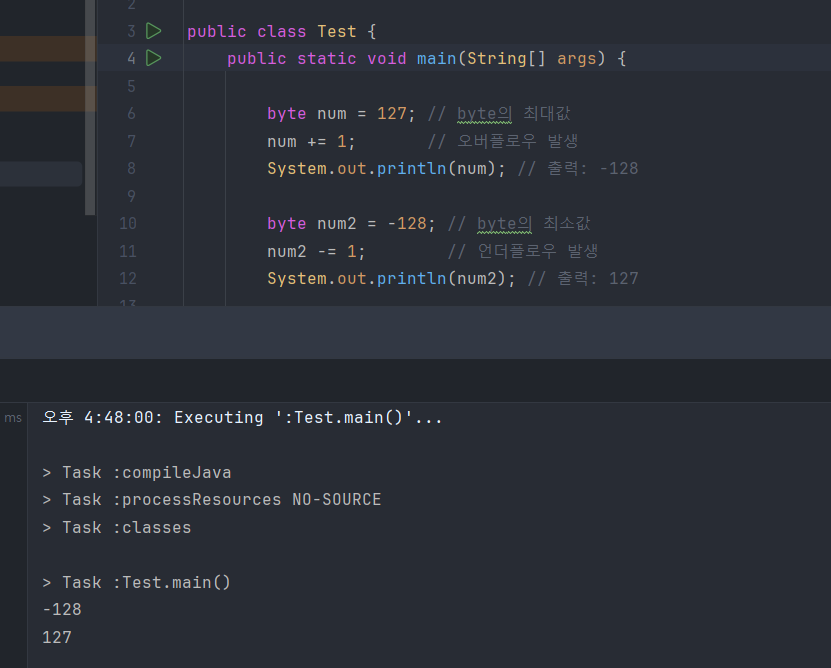 표현범위를 넘어가면 앞에서 부터 다시 할당한다.(byte형일때 127부터 )