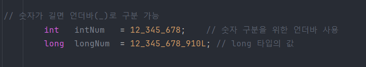 long 타입의 숫자는 반드시 값 뒤에 **L**을 붙여야 한다. 이는 숫자 1과 혼동을 방지하기 위해 대문자 L을 사용하는 것이 권장된다.